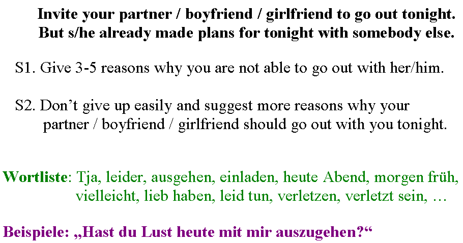 HA24--Extra10 Arbeitsblatt heute abgeben. [email me in time if you can't locate the video]. Videos angucken und Vokabeln lernen / Dialog schon mal planen: Einladung für heute Abend (FLASH mit mouse over bei den Wörtern.),